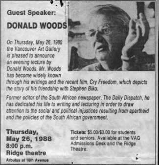 HE WAS NOT ABLE TO PUT ME IN TOUCH WITH DONALD WOODS, BUT AS IT HAPPENS, I MET THE LATE SOUTH AFRICAN MARTYR'S FRIEND ON MAY 26, 1988, WHEN HE WAS IN VANCOUVER IN CONJUNCTION WITH A SHOWING OF 'STEPHEN BIKO: BREAKING THE SILENCE', A 1987 FILM ABOUT THE MAKING OF 'CRY FREEDOM'.