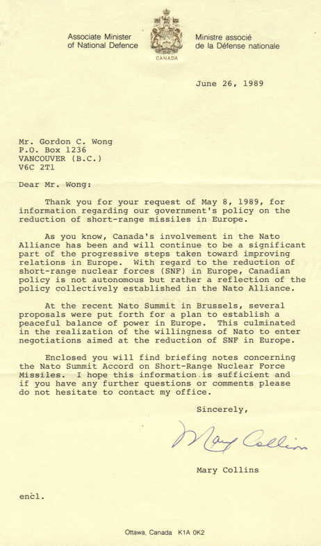 -THIS IS A SCAN OF THE COVER LETTER MS. COLLINS SENT ME ALONG WITH COPIES OF HER "BRIEFING NOTES" RE THE 1989 N.A.T.O. SUMMIT ACCORD ON SHORT-RANGE NUCLEAR FORCE MISSILES.