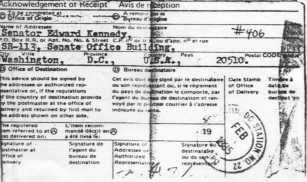 LIST OF CONTENTS FOR THE FEBRUARY 7, 1985 REGISTERED LETTER #406 TO SENATOR EDWARD KENNEDY: