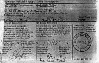 The Acknowledgement of Receipt for my June 24, 1988 registered letter #3580 to Frederic Van Zyl Slabbert was returned unsigned on July 14, 1988. Canada Post Customer Service advised me they don't think the card left Canada. I feel no rush to put a tracer on it. He and i spoke. If he wants to reply, he will.